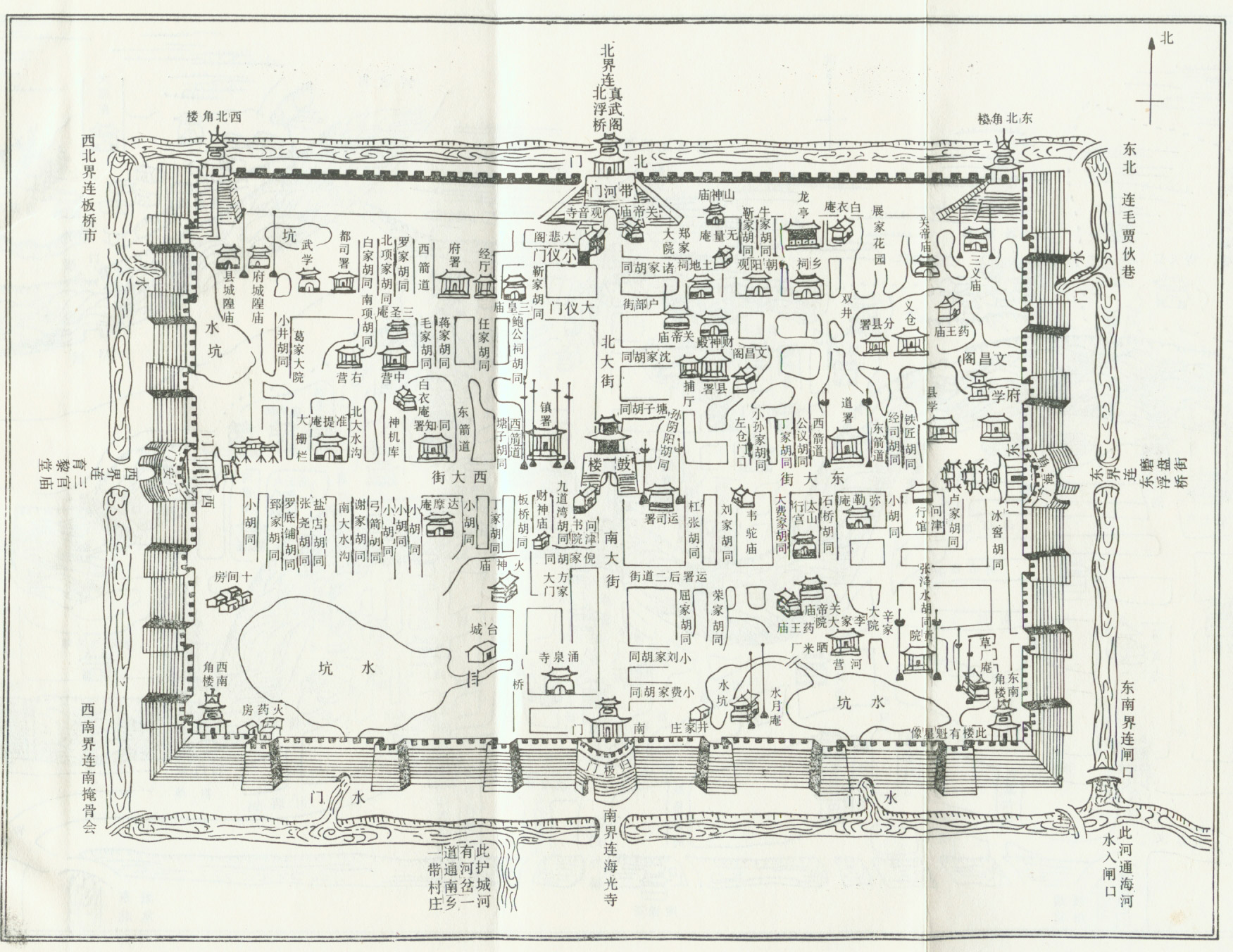 此《津门保甲图说》为道光年间绘制,可能为1846年左右。它为研究天津老城厢的整体布局,庙宇和人口的分布,提供了完整的历史资料。