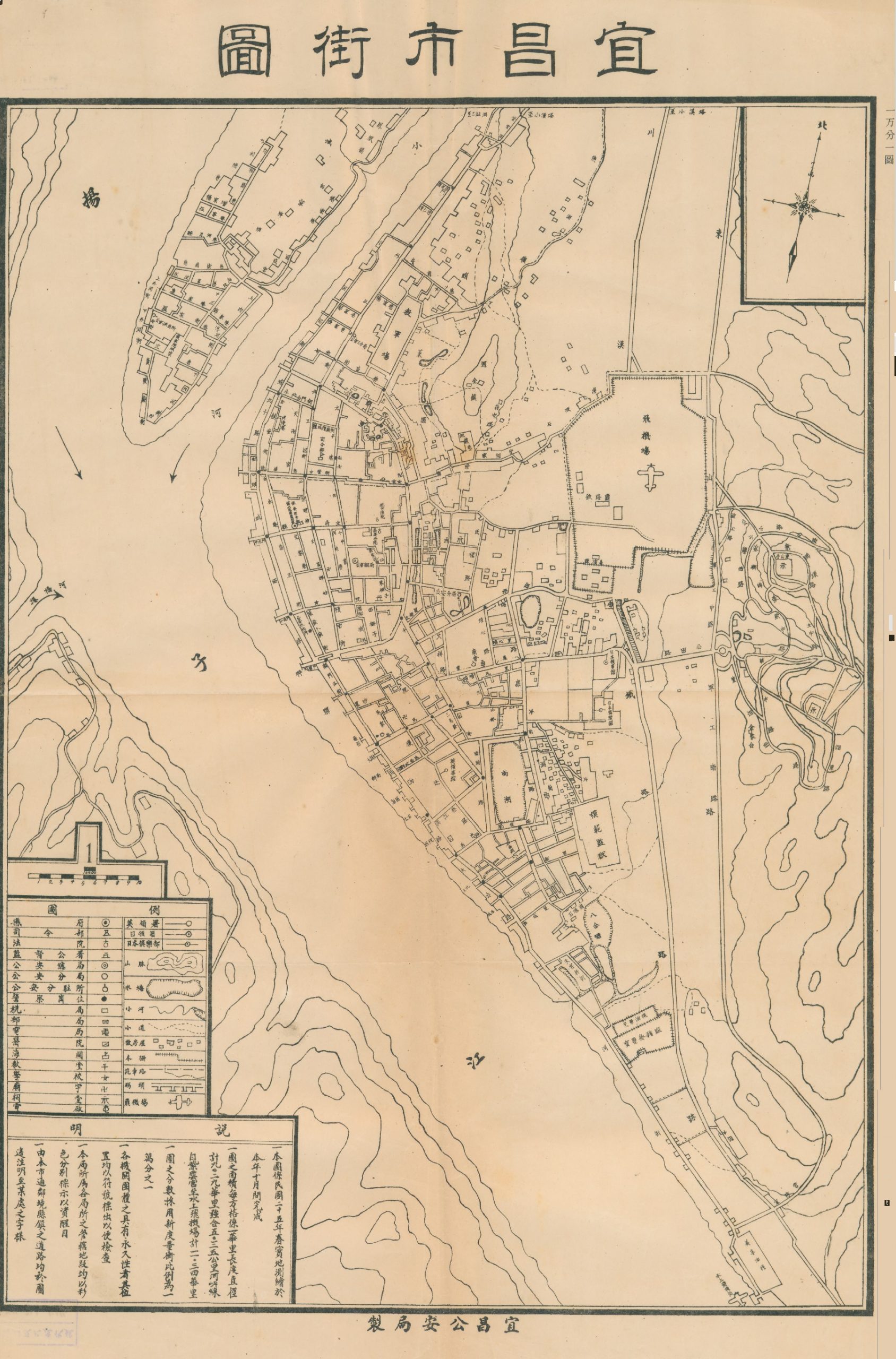 此《宜昌市街图》为民国25年(1936年)10月绘制的湖北省宜昌市地区详细城市地图,为当时的宜昌公^安^局绘制。 比例尺为1:10000,原图为44.0 * 61.2 (cm)中文素面单色图,中研院有藏。