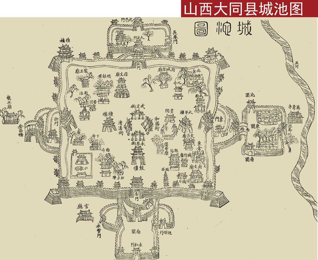此《大同县城池图》为清道光十年(1830年)绘制的大同县城简略城市地图,出自地方志数目。