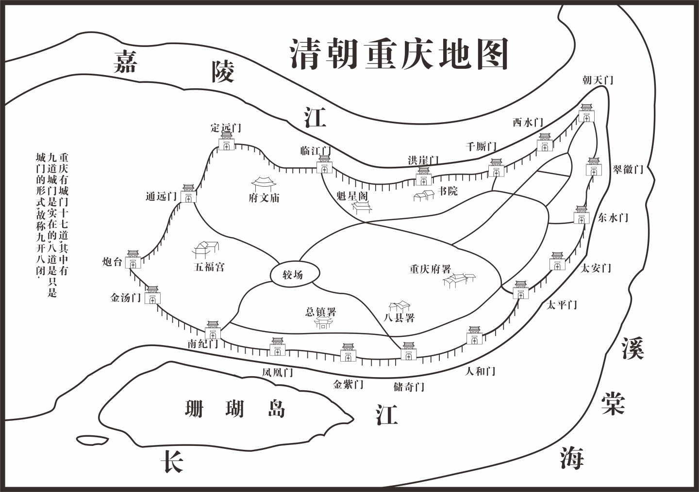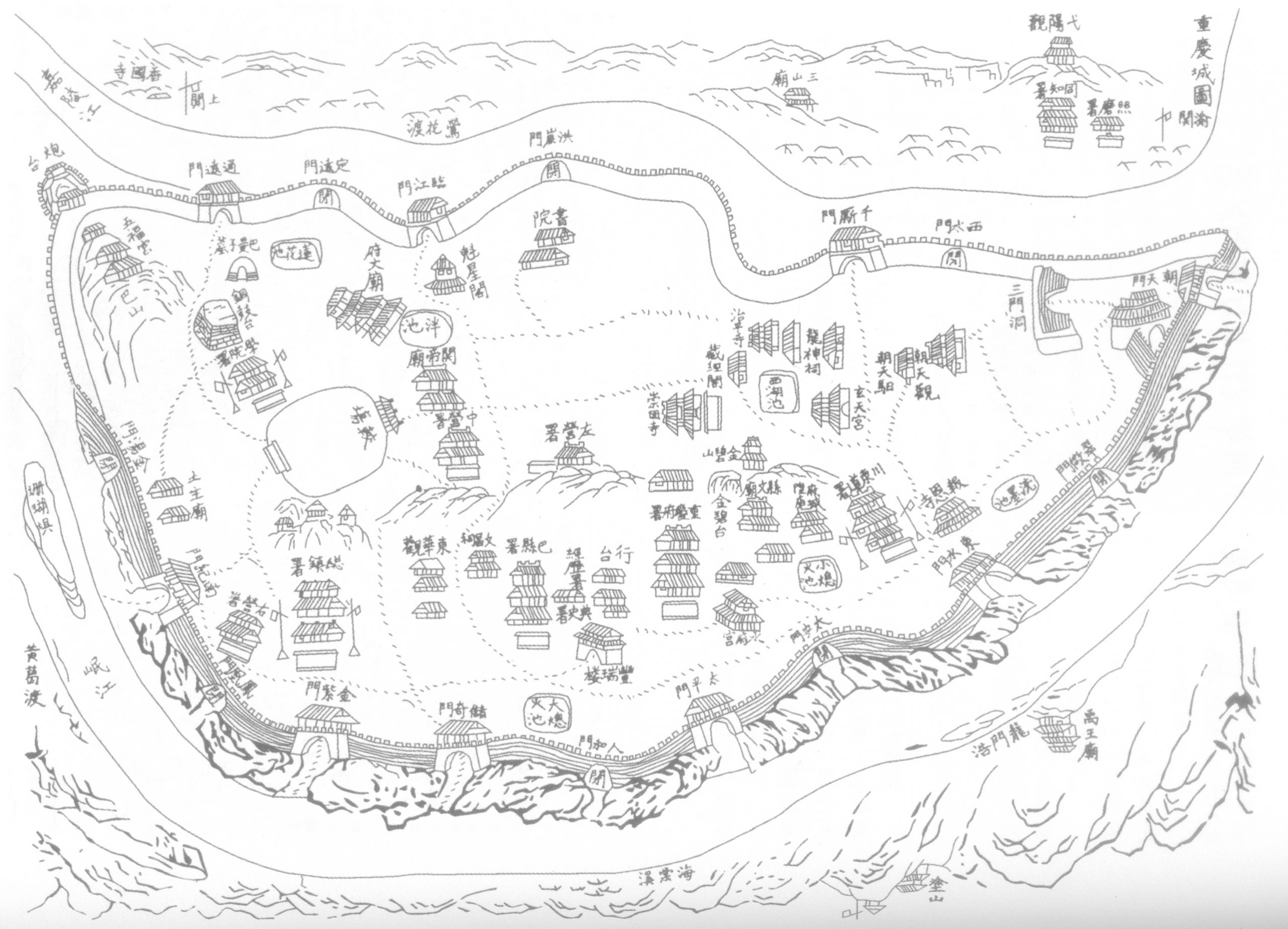 在发一个现代重新绘图,看看清朝时期的重庆城及城门分布图